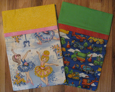 I realized a couple things as I was working on these. First, pillowcases are perfect for large prints that aren't easily used for quilting. It's nice to know that I can put them to good use. Second, I now have a greater appreciation for "blender" prints. It was fun to pick out prints for the borders and trims that coordinated with the main panels, but I couldn't always find a perfect match. I'll definitely be keeping an eye out for more fabrics like that in the future.
